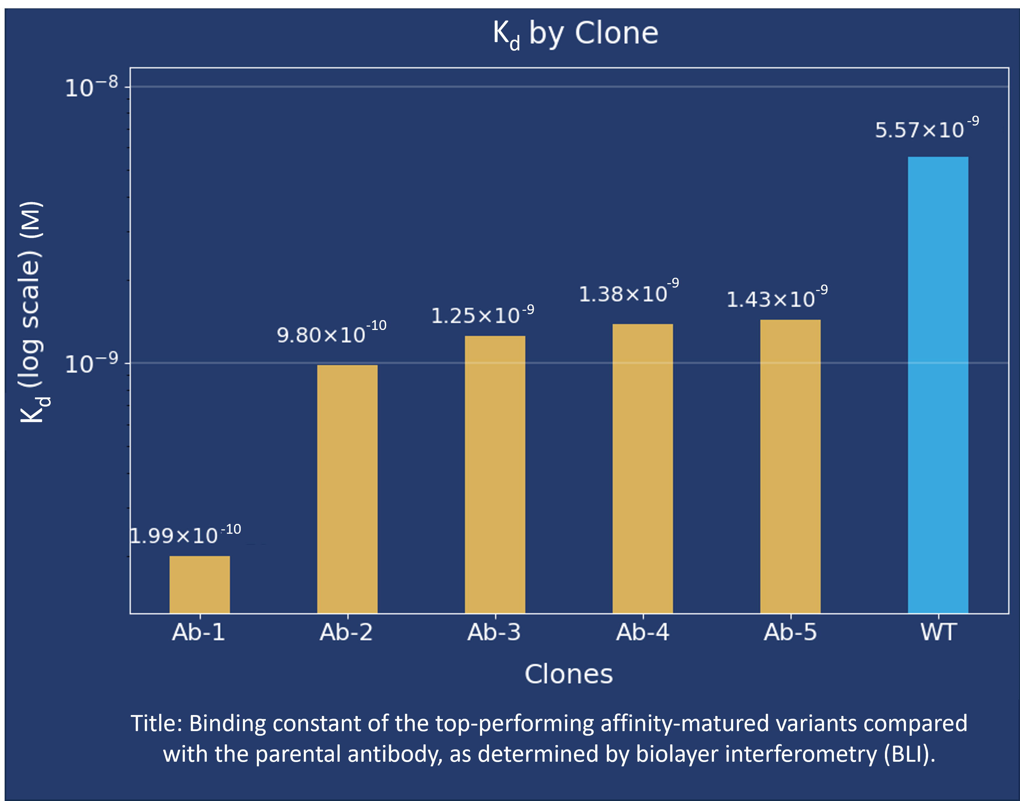 We successfully identified a lead antibody variant (Ab-1) showing an approximately 20-fold improvement in binding affinity relative to the parental antibody (WT), along with additional affinity-improved variants (Ab-2 to Ab-5) exhibiting 2- to 10-fold increases in affinity compared with WT.