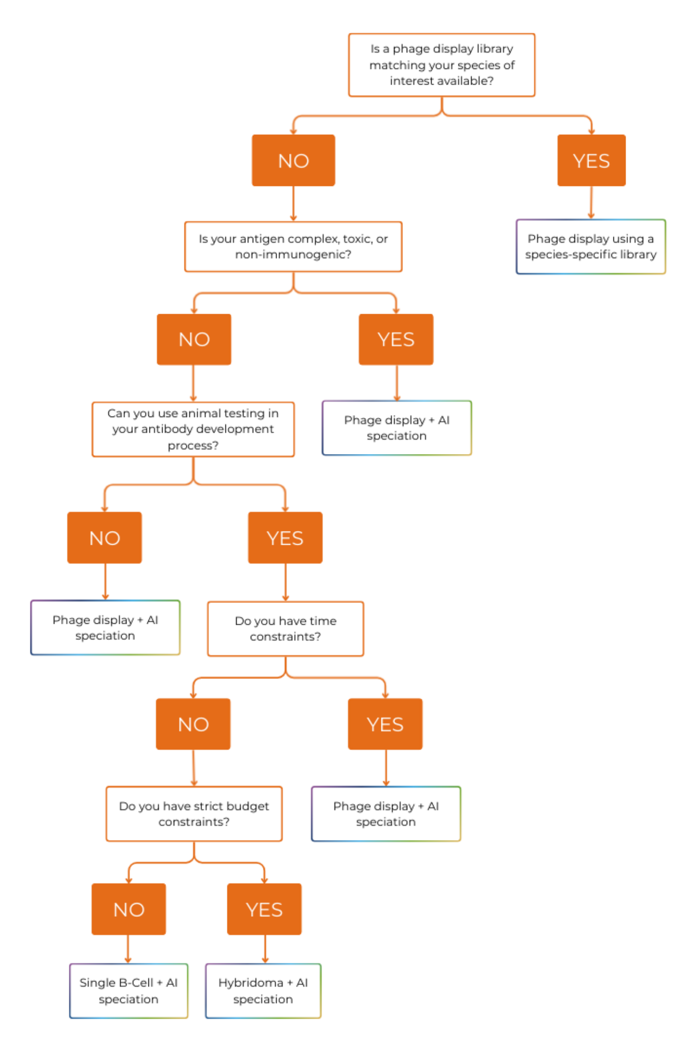 Therefore, if you cannot find a phage display library adapted to your species of interest, you need to dissociate discovery and speciation. We recommend AI speciation only with a suitable partner (use our checklist for service provider choice). Otherwise you can rely on CDR grafting.
