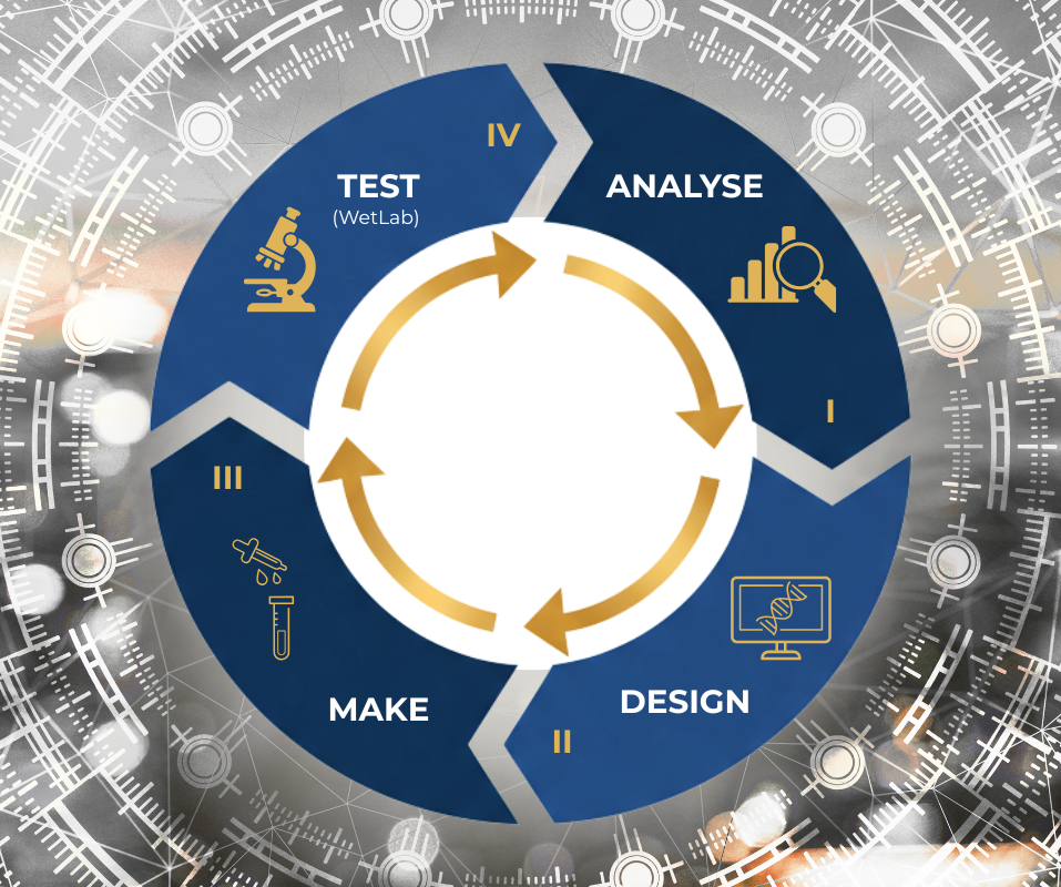 AI proposes optimized variants, we produce and test them in the lab, and experimental results feed back into the model to refine subsequent recommendations. This loop ensures every prediction is validated against real data, continuously improving our models with each project.